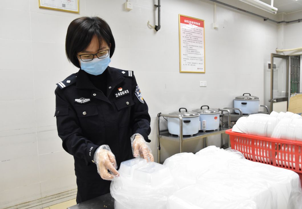 除了要保障防疫防護(hù)物資裝備,做好內(nèi)部防控是警保處的另一項(xiàng)重要工作任務(wù)。內(nèi)部防控疫情高危場合之一就是就餐食堂,這是做好內(nèi)部防控的關(guān)鍵環(huán)節(jié),不能有絲毫差錯(cuò)。如何在貫徹好市局黨委愛警暖警措施、解決民警值班就餐問題的同時(shí),又要做好內(nèi)部疫情防控工作,這是擺在闞禮和同事們面前的一道難題。在堅(jiān)持“防疫優(yōu)先、安全第一”前提下,闞禮提出實(shí)行就餐人員分餐制并得到組織支持批準(zhǔn)。在對飯?zhí)米龊梅雷o(hù)措施的同時(shí),引導(dǎo)就餐人員實(shí)行分時(shí)段分散取餐,并采取人性化服務(wù),提供代為取餐方式,減少人員集中度。