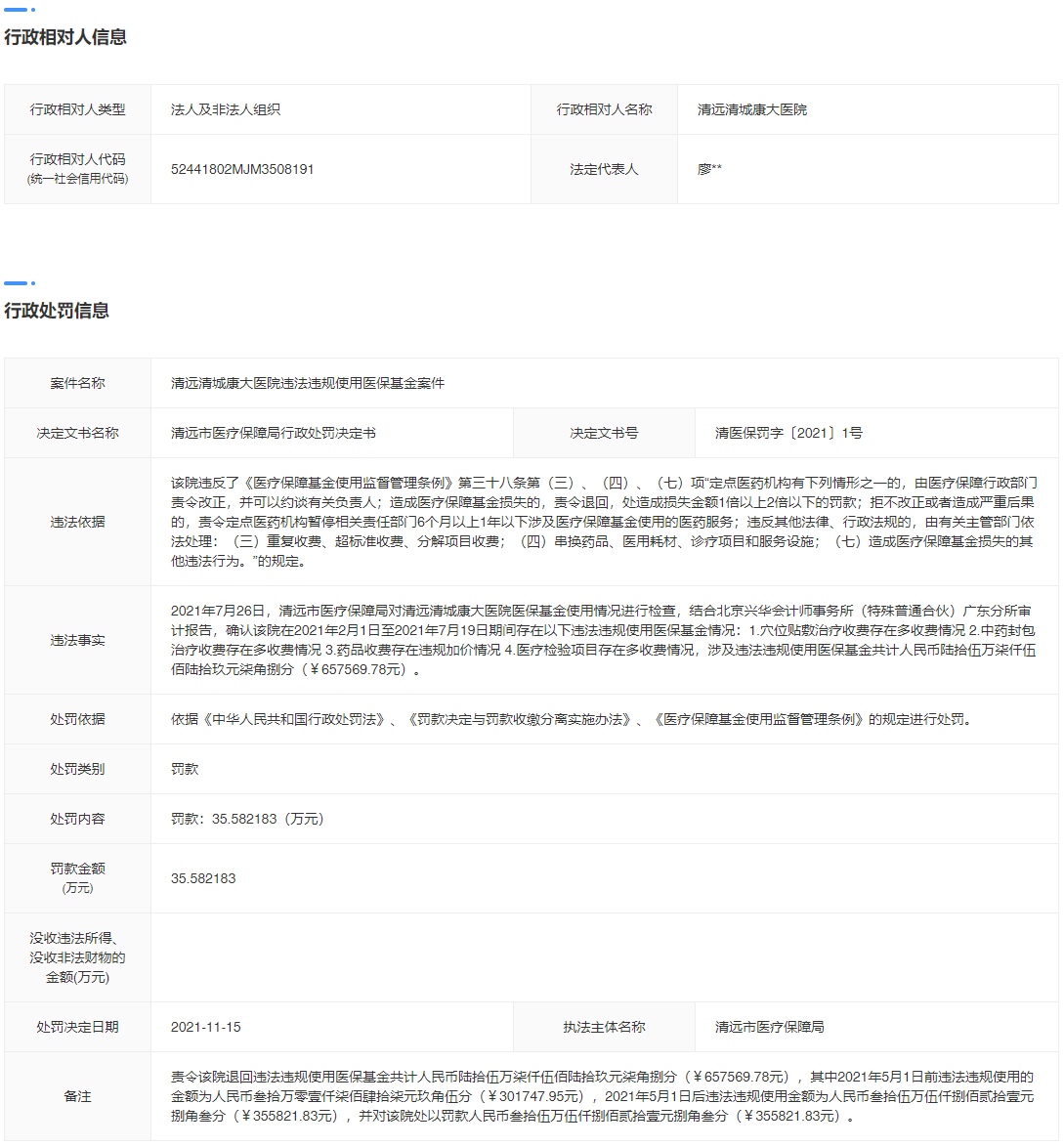 清遠清城康大醫(yī)院違法違規(guī)使用醫(yī)保基金案件