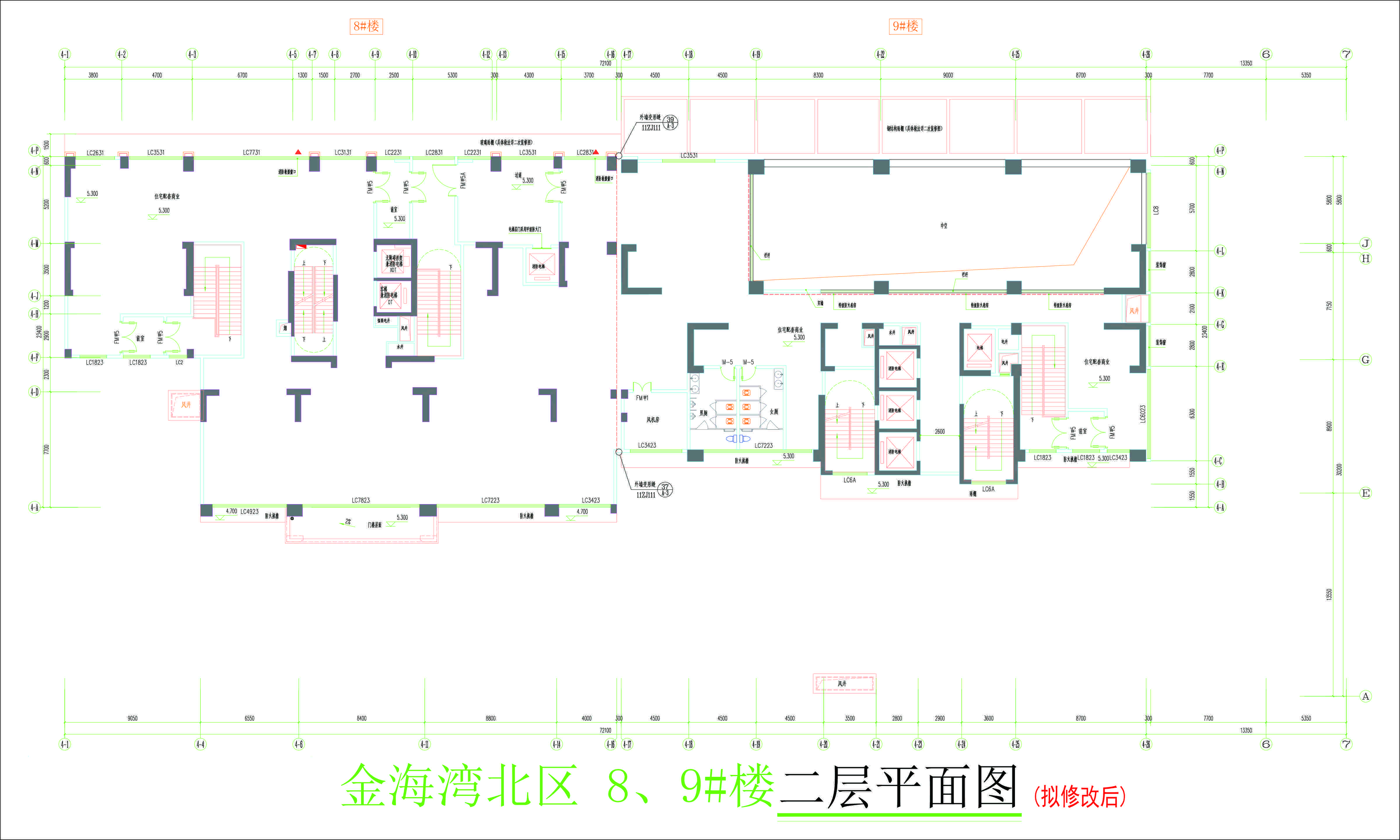 金海灣北區(qū)6、7#樓、8、9#樓、2#地下室建設(shè)工程設(shè)計方案修改,修改主要內(nèi)容:1:8、9#樓首層、二層重新布置,9#樓-1-22層增加電梯;原消防控制中心、監(jiān)控室、配電房更改,改為8#樓住宅樓裙樓集中設(shè)置,占用原南面室內(nèi)停車位置,少了6個室內(nèi)停車位。2:8#樓首層4-1~4-2軸交4-F~4-P疏散樓梯位置變更,二層中空風(fēng)機房位置變更。3:地下室變更疏散樓梯及機房位置,導(dǎo)致地下室停車位減少5個。4:因8、9#樓首層、二層調(diào)整導(dǎo)致減少11個室內(nèi)車位,所以在6、7#樓首層商鋪靠北位置增加11個室內(nèi)車位,達到總車位數(shù)不改變。本次調(diào)整不涉及8#樓的戶型調(diào)整。具體內(nèi)容詳見附圖。