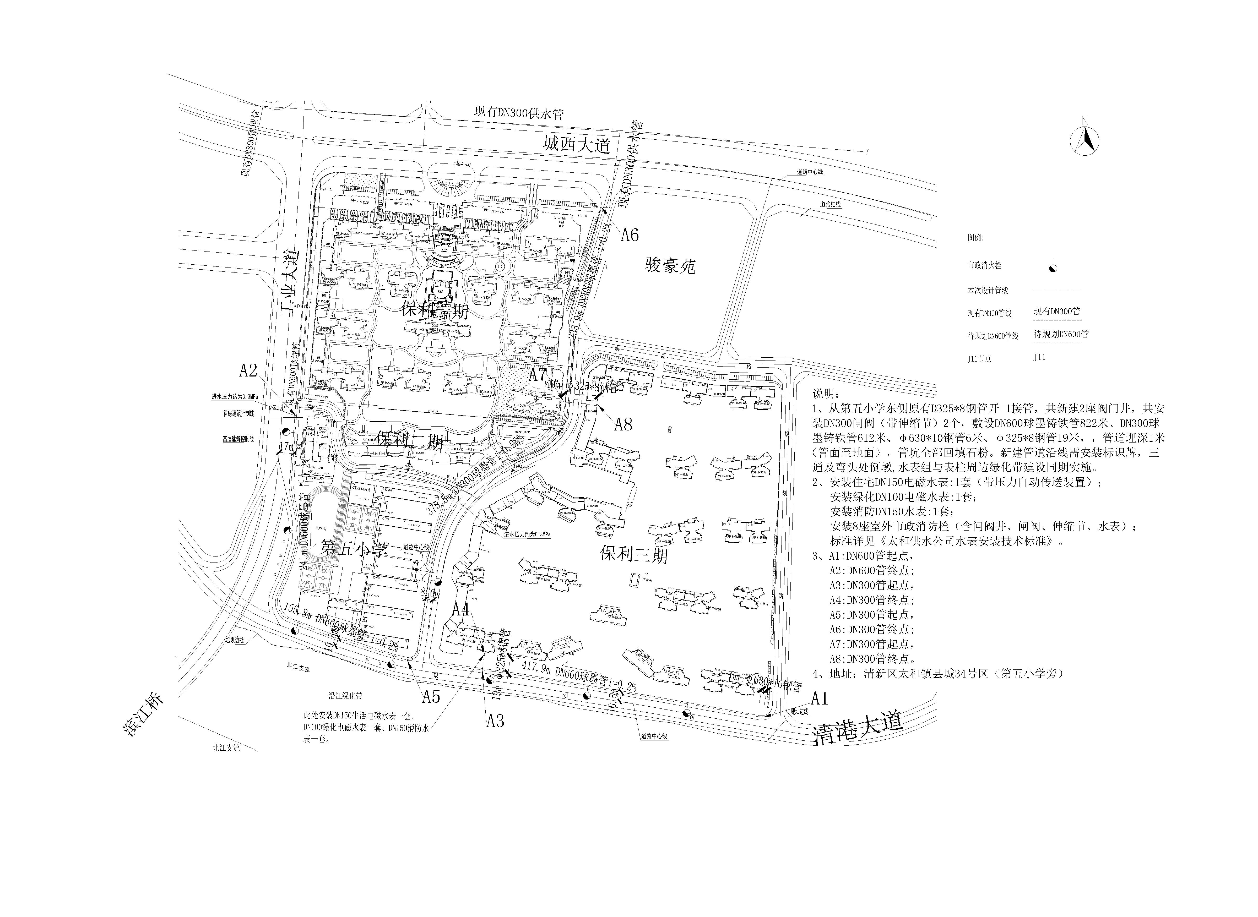 報(bào)來給水管線,從第五小學(xué)東側(cè)原有D325*8鋼管開口接管,共新建2座閥門井,共安裝DN300閘閥(帶伸縮節(jié))2個(gè),敷設(shè)DN600球墨鑄鐵管822米、DN300球墨鑄鐵管612米、φ630*10鋼管6米、φ325*8鋼管19米,管道埋深1米(管面至地面),管坑全部回填石粉。
