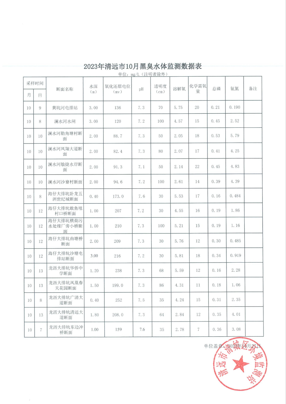 (10月)2023年清遠(yuǎn)市黑臭水體監(jiān)測(cè)數(shù)據(jù)表