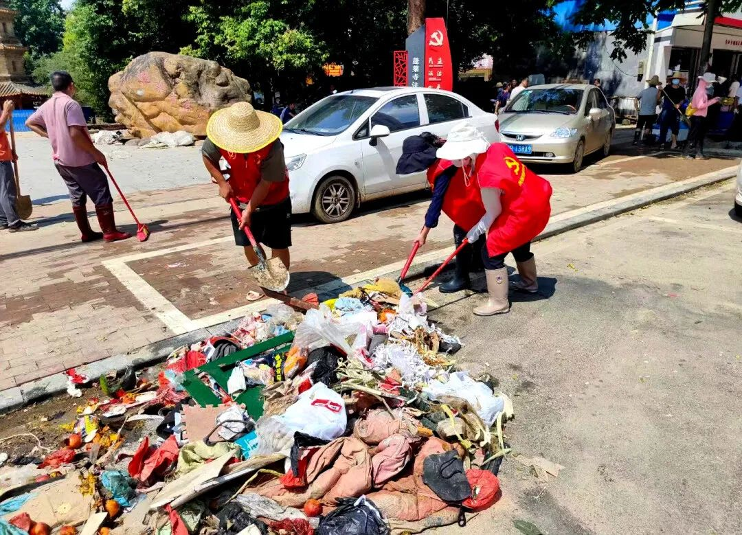 “同志們,我們再加把勁,路面淤泥碎石很快清理完成了?!背弥鞖馇绾?,大崀鎮(zhèn)松林村黨支部書記黃火炎帶領(lǐng)村“兩委”干部、黨員志愿者,冒著暴雨過后的毒辣陽光,積極開展清淤工作。