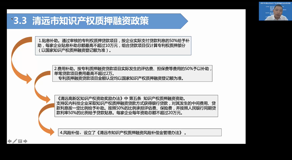 培訓(xùn)邀請(qǐng)了廣州知融資產(chǎn)評(píng)估有限公司劉前明總經(jīng)理、廖緒豪項(xiàng)目經(jīng)理以及清遠(yuǎn)知識(shí)產(chǎn)權(quán)協(xié)會(huì)陳翰麟副秘書長(zhǎng)等專業(yè)人士,對(duì)知識(shí)產(chǎn)權(quán)質(zhì)押融資與評(píng)估、知識(shí)產(chǎn)權(quán)質(zhì)押登記注意事項(xiàng)及相關(guān)要求等進(jìn)行授課,還邀請(qǐng)了廣東連州農(nóng)村商業(yè)銀行股份有限公司羅振輝副經(jīng)理介紹該行近年來開展專利質(zhì)押、商標(biāo)質(zhì)押貸款方面的經(jīng)驗(yàn)和優(yōu)秀案例。為企業(yè)、金融從業(yè)人員熟悉掌握運(yùn)用知識(shí)產(chǎn)權(quán)金融政策,促進(jìn)知識(shí)產(chǎn)權(quán)與金融資源的有效融合,大力推動(dòng)全市知識(shí)產(chǎn)權(quán)質(zhì)押融資工作提供了全方位的專業(yè)幫助。