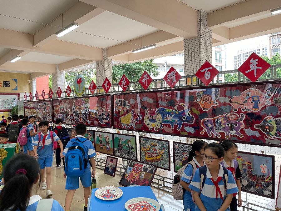 此外,畫展還布置了大量美術(shù)作品,有充滿墨韻的國畫“清遠雞”“花鳥畫”、中華優(yōu)秀傳統(tǒng)民俗文化剪紙作品、以“?!睘橹黝}的黏土作品、紙袋畫作品、書法作品等。同時,展覽期間配以學校師生現(xiàn)場民族樂器表演,使進入書畫展的觀賞者享受視聽盛宴。