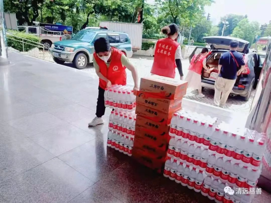 清遠市慈善總會工作人員與捐贈企業(yè)人員搬運物資