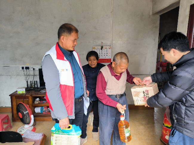 在脫貧戶家中,駐村第一書記陳俊鋒和村兩委干部與群眾面對(duì)面交談,詳細(xì)詢問他們的生產(chǎn)情況、生活狀況,聊家常、談新年、送祝福,傾聽他們的意見心聲,引導(dǎo)他們保持樂觀向上的生活態(tài)度,增強(qiáng)戰(zhàn)勝困難的信心和勇氣,并送上米面油等慰問品?!爸x謝你們,謝謝黨委!讓我們在這寒冬里感受到滿滿的暖意。”脫貧群眾對(duì)黨和政府的關(guān)懷紛紛表達(dá)謝意。