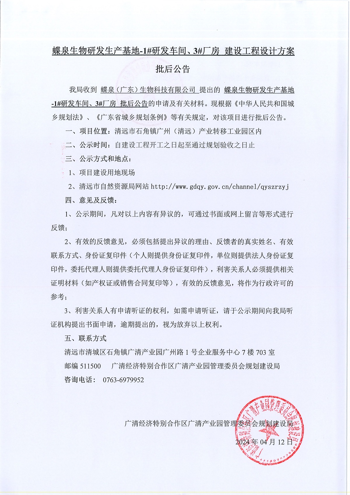 蝶泉生物研發(fā)生產(chǎn)基地-1#研發(fā)車間、3#廠房 建設工程設計方案 批后公告
