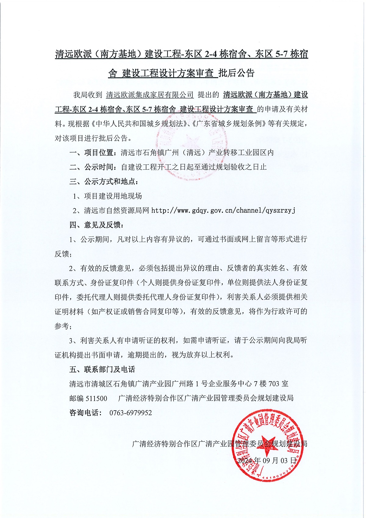 清遠(yuǎn)歐派(南方基地)建設(shè)工程-東區(qū)2-4棟宿舍、東區(qū)5-7棟宿舍 建設(shè)工程設(shè)計(jì)方案審查 批后公告