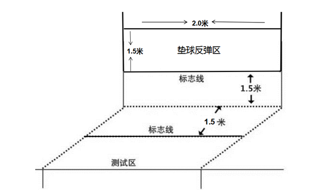 (3)考生在離墻1.5米線外做墊球準備,腳步左右移動區(qū)域寬度2.0米。墊球反彈區(qū)域為離地1.5米、左右寬2.0米、高1.5米的長方形。